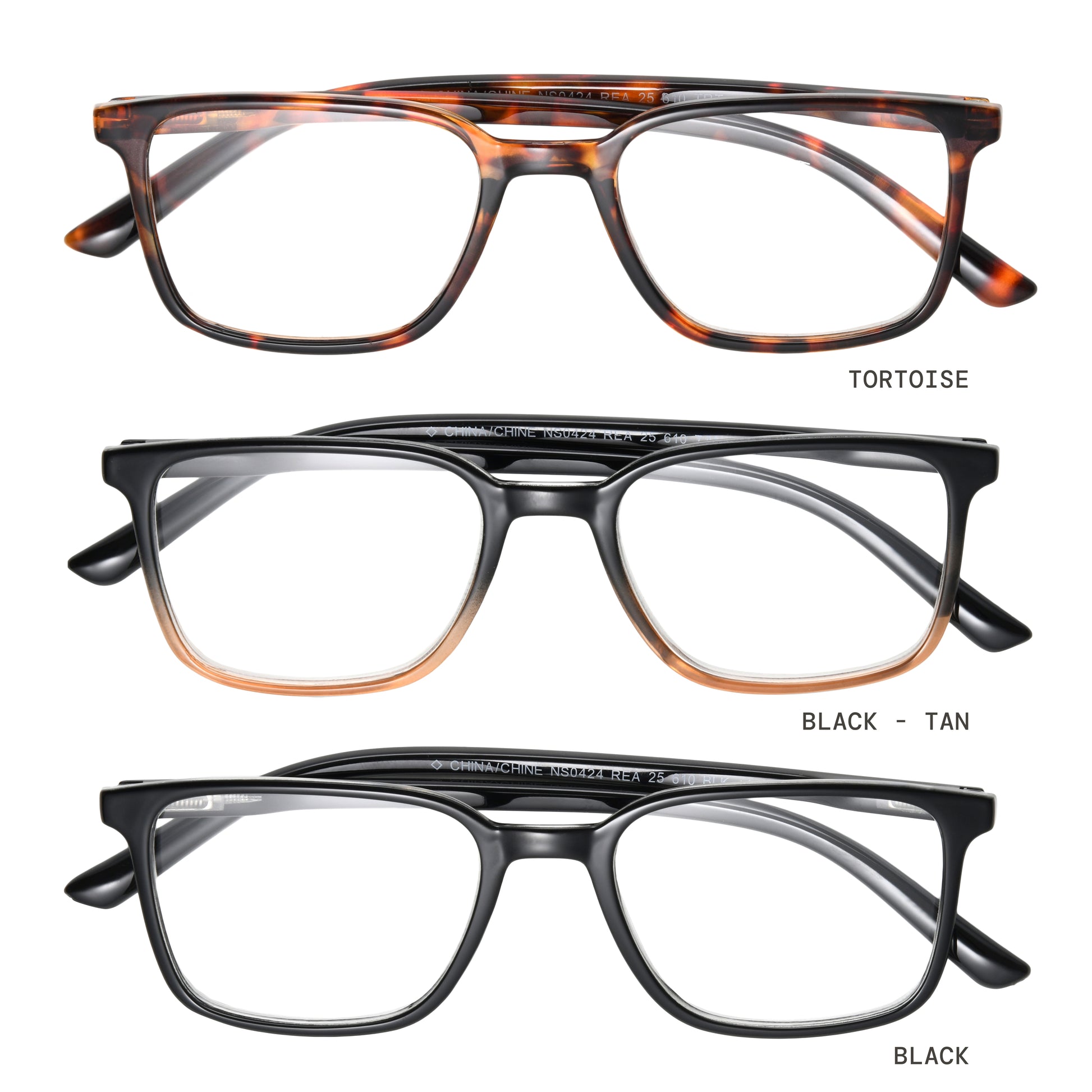 This is The Emil Multipack. The Emil reading glasses feature a bold square frame, offering a classic yet contemporary look. The slender temples provide a cohesive design that’s both comfortable and stylish. Equipped with fully magnified lenses, they are also scratch and impact-resistant.