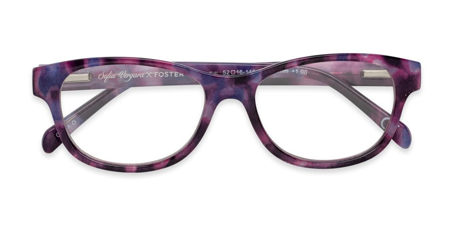 These classic, must-have readers are offered in a rectangle shape with colorful frame options and decorative rivet detailing on the hinges. These fully magnified reading glasses feature both scratch-resistant and thin, aspheric lenses for a great look and feel. This pair of glasses comes with the case and cleaning cloth pictured for easy storage and protection. Shop the Sofia Vergara® x Foster Grant® collection.* Please select your lens type, power, and color before placing your order. All fields must be selected. This style Multi Focus™ Blue lenses have three different powers that allow you to use them for reading, computer use, and interacting, and have a patented lens technology that helps reduce approximately 30% of potentially harmful blue-violet light*. This pair of glasses comes with the case and cleaning cloth pictured for easy storage and protection. Shop the Sofia Vergara® x Foster Grant® collection.* Please select your lens type, power, and color before placing your order. All fields must be selected.Disclaimer: *Potentially harmful blue-violet light refers to the 415-455 nanometer range of the visible light spectrum. The percentage represents the average amount of potentially harmful blue-violet light filtered at 5 nanometer increments in this range. Covered under U.S. Pat. No. 8,360,574. Other U.S. and foreign patents pending.