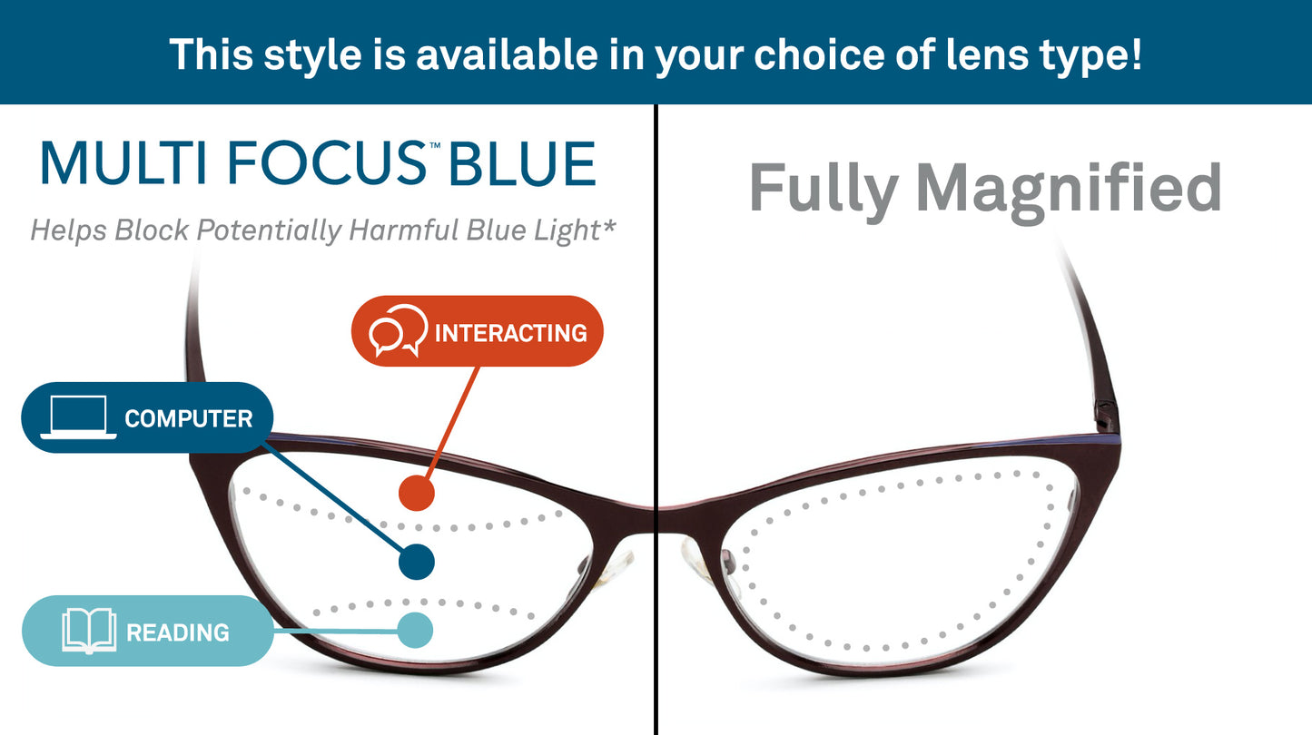 This style has Multi Focus™ Blue lenses that have three different powers that allow you to use them for reading, computer use, and interacting.